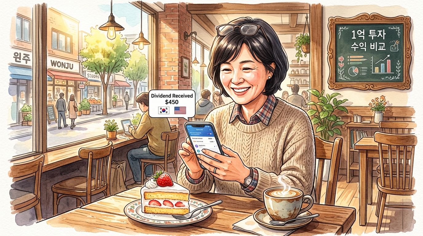 실제로 지난달 제 계좌를 확인했을 때, 은행 예금 5,000만 원에서 나오는 이자는 여전히 10만 원대에 머물러 있었지만, 나머지 5,000만 원을 투자한 미국 주식 계좌에서는 환율 상승분까지 더해져 약 45만 원의 배당금이 입금되었습니다. 원주 시내의 카페에서 망설임 없이 케이크를 주문할 수 있었던 원동력은 바로 이 '달러 배당금'이었습니다. 아래 표는 1억 원을 기준으로 제가 직접 시뮬레이션한 비교 데이터입니다.